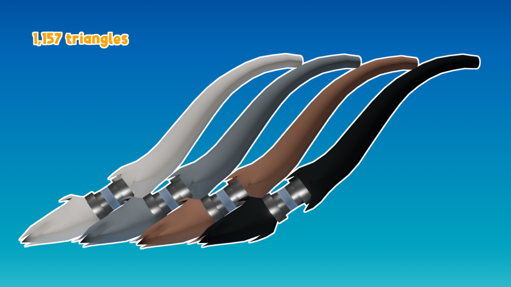 A set of ears and a tail for VRChat avatars. Four colors by default. Can be changed with the hue slider in Poiyomi as well. Tail comes with two types of decals with two colors each (striped and tipped). Ears come with one type of decal with two colors (tipped). I'll also provide any updates these items get.